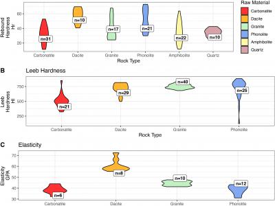 实验引入的岩性和当地岩石类型的岩石硬度。数据以小提琴图的形式呈现。形状的宽度反...