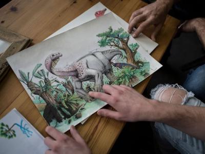 拉德马赫尔笔下的劳氏鳄。舒瓦尼埃(左)与拉德马赫尔(右)商讨绘画。(神秘的地球...