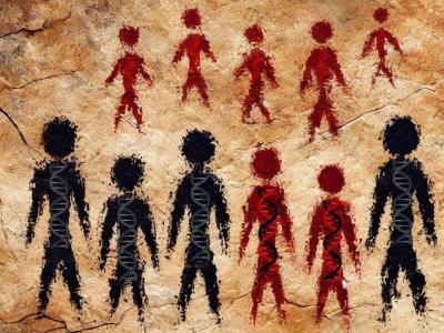 一组尼安德特人(黑色)和一群现代人(红色,顶排)之间的相遇,后代显示了最近的尼...