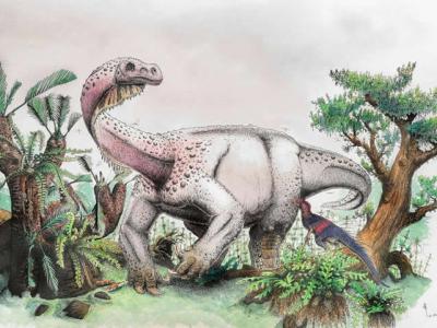 插图中一头Ledumahadi mafube正在侏罗纪早期的南非觅食。画面...