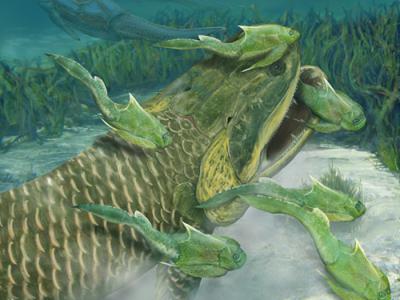 鸿鱼生态复原图,在泥盆纪古湖泊中与宁夏鱼和桨麟鱼...