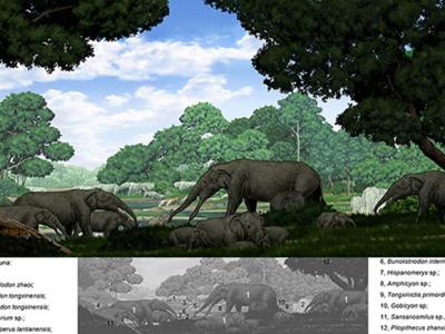 隐齿象生存环境复原图(陈瑜绘) 隐齿象不同年龄性别的个体(王世骐供图) (...