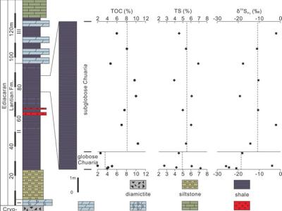 蓝田岩芯柱状图以及Chuaria赋存层位的总有机碳、总硫和黄铁矿硫同位素 丘尔藻...