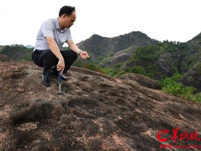 8月13日,河源石硖恐龙蛋化石埋藏地保护区,河源恐龙博物馆馆长杜衍礼双脚站在恐...