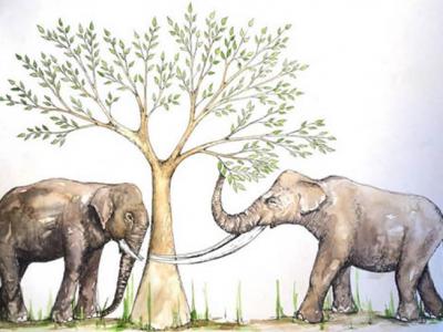 华南晚更新世象类生态复原图,亚洲象(左)的食性中草食的比例较大,剑齿象(右)...