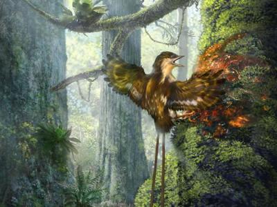 被树胶粘住的反鸟类想象图。(作者:张宗达) 人手,天使之翼标本与反鸟类的同...