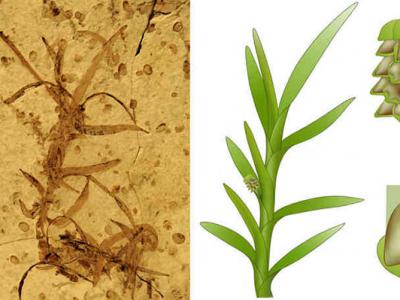 左图:道虎沟雨含果的模式标本。右图:道虎沟雨含果植物局部、果序、以及果实、心...