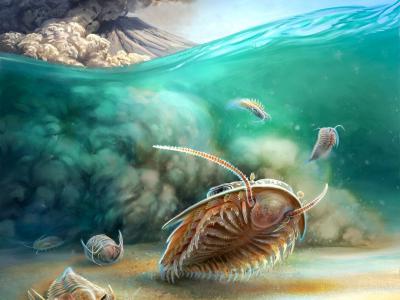 5.1亿年前,在火山灰流中埋葬前的瞬间,两种三叶虫的艺术重建。uux.cn©A.El A...