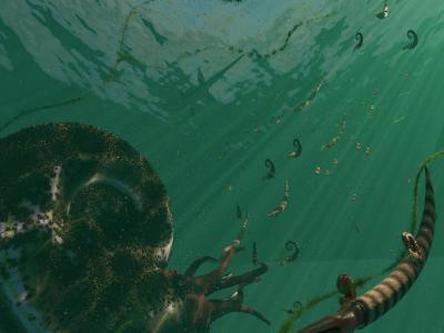 菊石沐浴在白垩纪晚期的阳光下。鸣谢:uux.cn卡勒姆·普索尔的作品(神秘的地球uux....