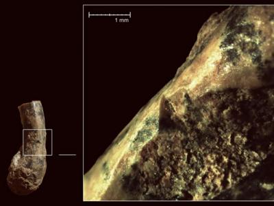 Qesem洞发现的乌龟肱骨化石上的人类刮削痕迹(Image credit: Ruth Blasco et al....