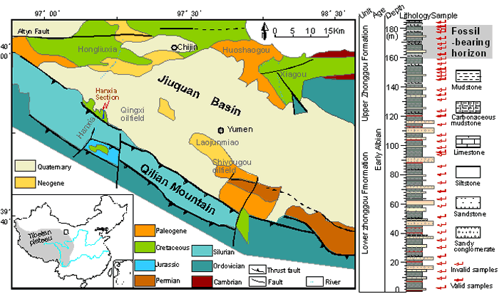 酒泉盆地西部地质简图及旱峡剖面中沟组岩性柱状图 酒泉盆地中沟组早期被子植物...
