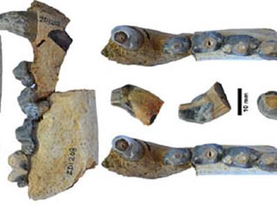 一块哺乳动物头骨化石,牙齿窝里的沉积物,原来是史前蜜蜂筑的巢穴。图片来源:uux...