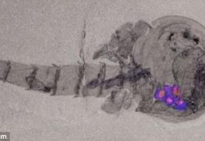 科学家在瓦普塔虾的化石中发现虾卵(紫色部分)。 研究员指今次发现更进一步了...