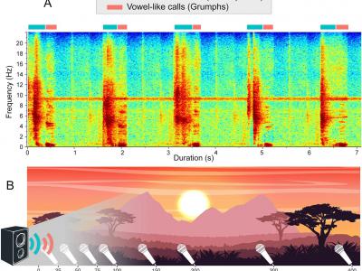 猩猩类辅音和类元音叫声的频谱图(上图)和实验装置(下图)。鸣谢:uux.cn/科学报告(20...