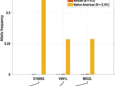 D1908G、V991L和M932L尼安德特人变异体在美洲土著、欧洲和非洲血统的SCN9A染色体片...