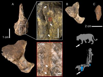 早更新世晚期人族或在欧洲南部与硕鬣狗争夺剑齿虎和美洲豹遗弃的尸体。Credit: uux...
