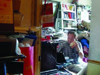 陈功富在堆满报刊、书籍、研究资料和杂物的家中 13日晚,UFO高级专家陈功富研究...