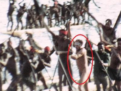 1名相信是迈克尔.洛克菲勒的白人男子(红圈示),被拍到跟食人族在一起划艇。 《...