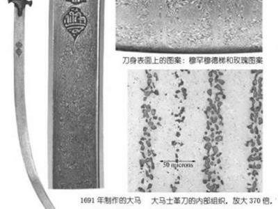 典型的大马士革刀及其表面水纹状图案(穆罕穆德梯和玫瑰图案)以及对应的组织(成...