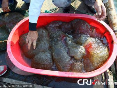 一个不明“水生物”被打捞进船上的大盆里碎成了很多块 2012年10月8日,浙江嘉...