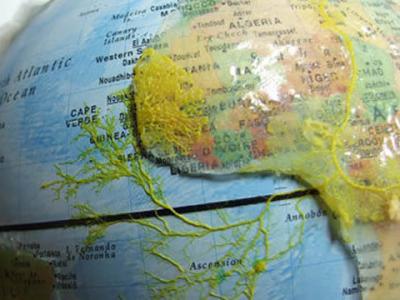 在亚达马斯基的实验中,黏菌逐渐占领了整个琼脂地球仪,路径似乎在模拟人类历史发...