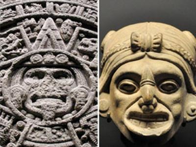 阿兹特克文明的太阳历石(左)和玛雅雕塑(右) 在墨西哥城国家人类学博物馆内是...