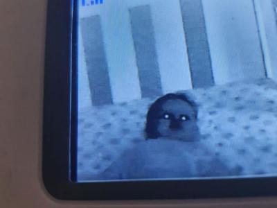 监视器中婴儿睡觉眼放光似鬼魂附身吓坏父母(© 照片: twitter/@PassionPopSoc)...