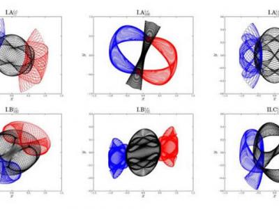 6类新发现的三体问题周期解。蓝线: 物体1之轨道; 红...