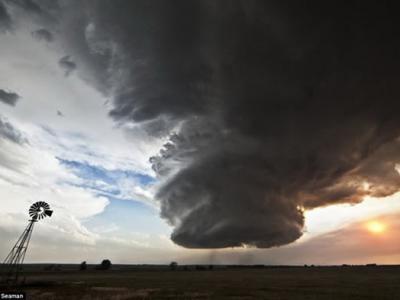 遥远科罗拉多州燃烧产生的烟雾对日落添加了红色调,并以风暴拍摄增添了意外的效果...
