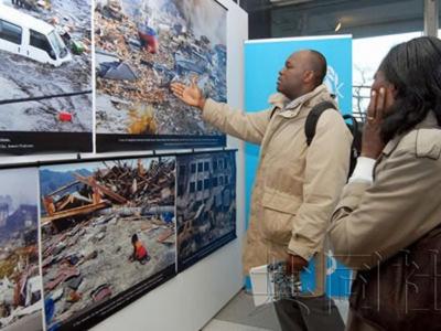 3月5日,东日本大地震主题照片展在纽约的联合国总部举行。图为前往参观的人们驻足...