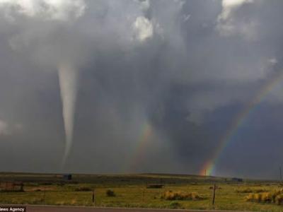 美国科罗拉多州空中美丽彩虹邂逅凶猛龙卷风