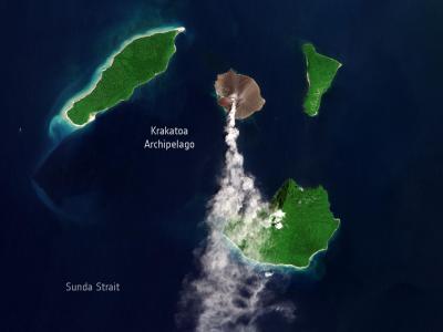 图为2022年2月3日,哥白尼哨兵2号任务拍摄的印度尼西亚拉卡塔岛的喀拉喀托火山(An...