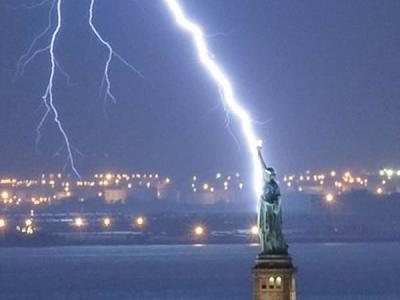 杰伊·菲恩拍下这张闪电击中纽约港自由女神像的照片 这个标志性的纽约纪念碑由...