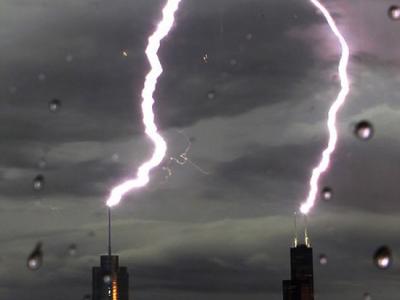 闪电同时击中芝加哥两大标志性建筑威利斯大厦和川普大厦楼顶 闪电同时击中芝加...