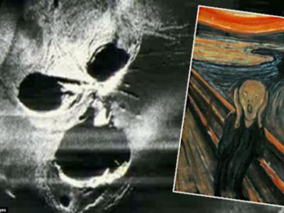 冰岛海岸警卫队机载雷达捕捉到一张火山口照片(左),酷似经典画作“尖叫”(右)中惊...