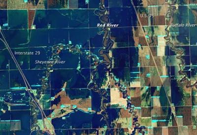 伪色图:显示法戈市附近区域洪水泛滥情形。 自然色调图片:洪水和泥浆与休耕田...