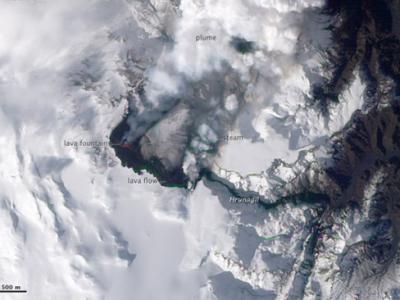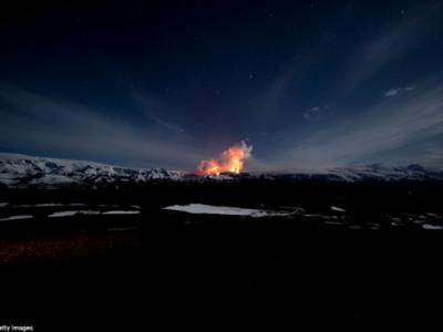 火山爆发期间,从周围数英里的冰岛冰川上方都能清晰看到炙热的橙色熔岩和灰烬 ...