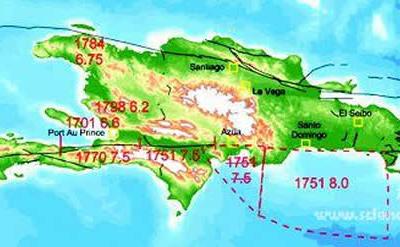 发生在18世纪的地震(红线)袭击了伊斯帕尼奥拉岛。而1月12日发生的海地地震使曾...