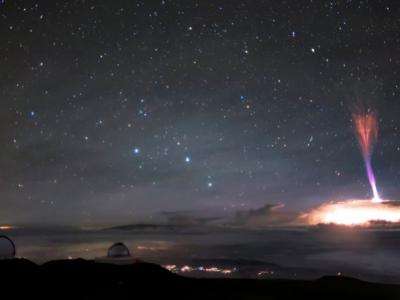 望远镜拍下夏威夷的莫纳克亚火山附近蓝色喷流与红色精灵闪电共舞的罕见画面(神秘的...