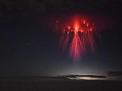 美国德州天文学家Stephen Hummel在洛克山山脊上捕捉到“红色精灵”自然现象(神秘的...