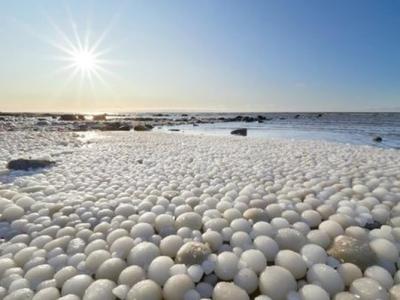 芬兰北部海卢奥托岛海滩布满神秘白色圆形“异形蛋” 专家指为罕见自然现象“冰球”...