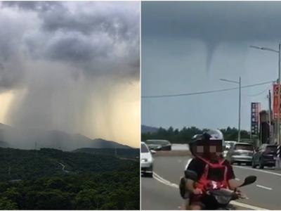 台湾的北海岸上周六下午同时出现雨瀑和水龙卷的奇景。(神秘的...