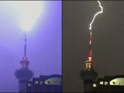 有人拍到闪电击中天空塔的一刻。天空塔是奥克兰著名...