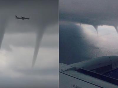 俄罗斯索契外海飞机从3个龙卷风之间飞越,场面十分...