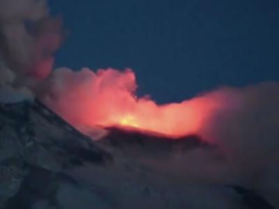 火红岩浆喷上高空,将西西里夜空染成一片红。 火山爆发一刻,大量火山灰喷发。...