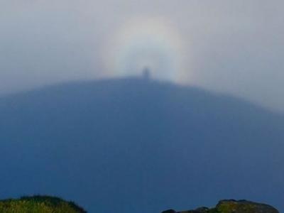 劳里看到难得一见的“布罗肯奇景”。 蓝天下山间被浓雾覆盖,彩虹光环罩住的人...