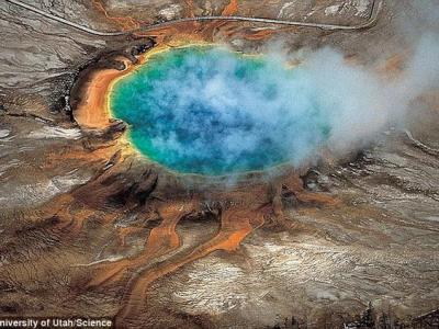 这是黄石公园的大棱镜温泉,专家指出,黄石公园地下火山每年喷发概率仅为70万分之...