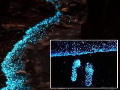 海滩上萤光闪闪,宛如灿烂星河,滩边有蓝光脚印(小图)。 专家分析,海水发光...