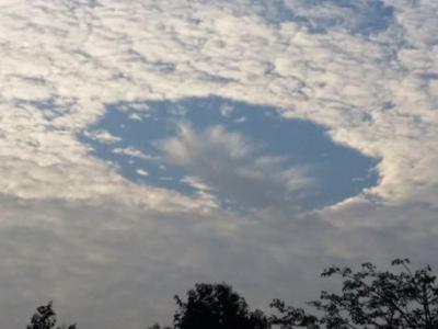 深圳南山区更有人摄得“鸳鸯云”如白云中间出现一圆洞。 有深圳市民在莲花山附...