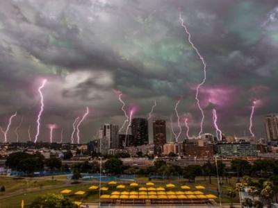 有摄影师以多重曝光技术,拍下罕见的多重紫电奇景。 悉尼多处出现紫色闪电 ...